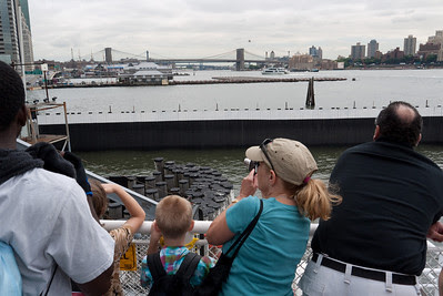 Midway across the bridge we stop to view our destination - that verdant island on the horizon in the middle of the harbor The large construction site just below is a future section of the miles-long Brooklyn Bridge Park that is being built along the East River.